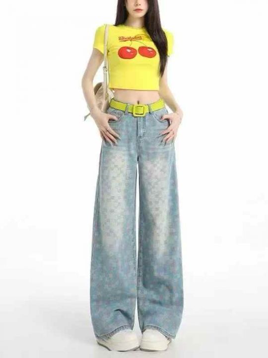 大整款棋盘格阔腿牛仔裤女夏季新款高腰宽松显瘦慵懒百搭拖地裤316条全清13....