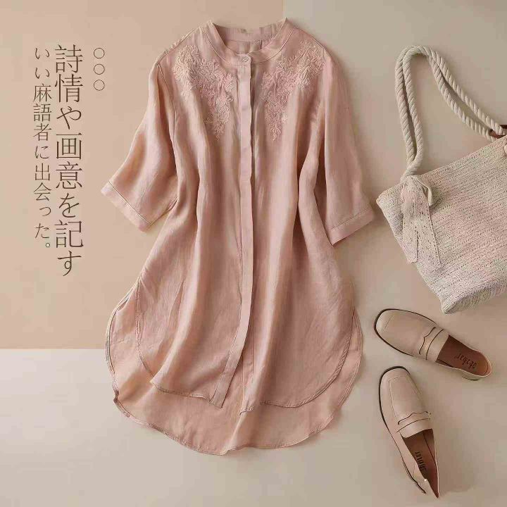全清3.8,夏季新款五分袖刺绣棉麻衬衣女夏长款外搭圆...