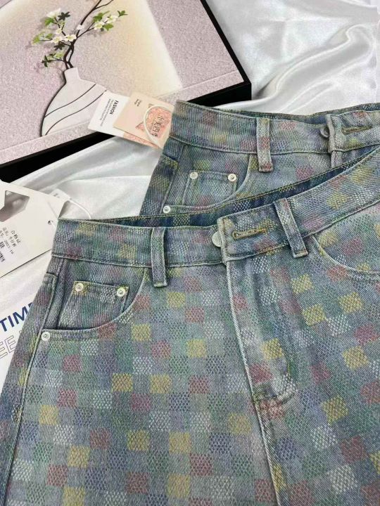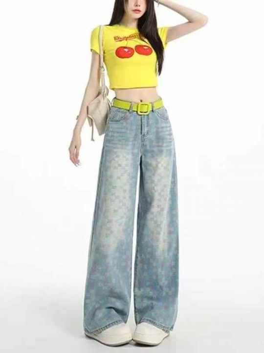 大整款棋盘格阔腿牛仔裤女夏季新款高腰宽松显瘦慵懒百...