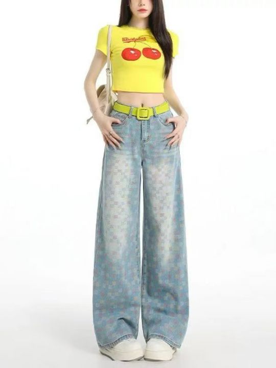 大整款棋盘格阔腿牛仔裤女夏季新款高腰宽松显瘦慵懒百...