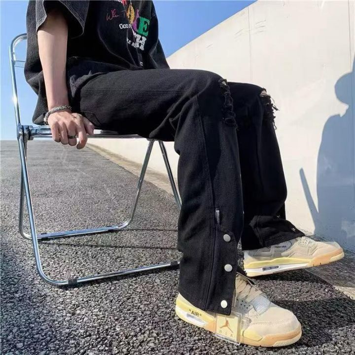 ☕️夏季黑色破洞牛仔裤男欧美高街拉链直筒裤潮牌阔腿...