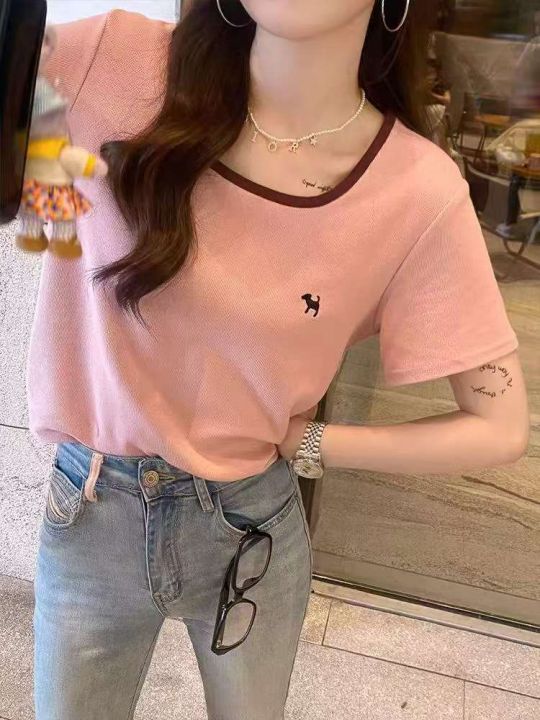 品牌纯棉撞色刺绣圆领修身显瘦短袖,[爱心]200件左右,粉色为主其它颜色几件,尺码S-XL,穿80-120斤,原包装瑕疵,分货加一