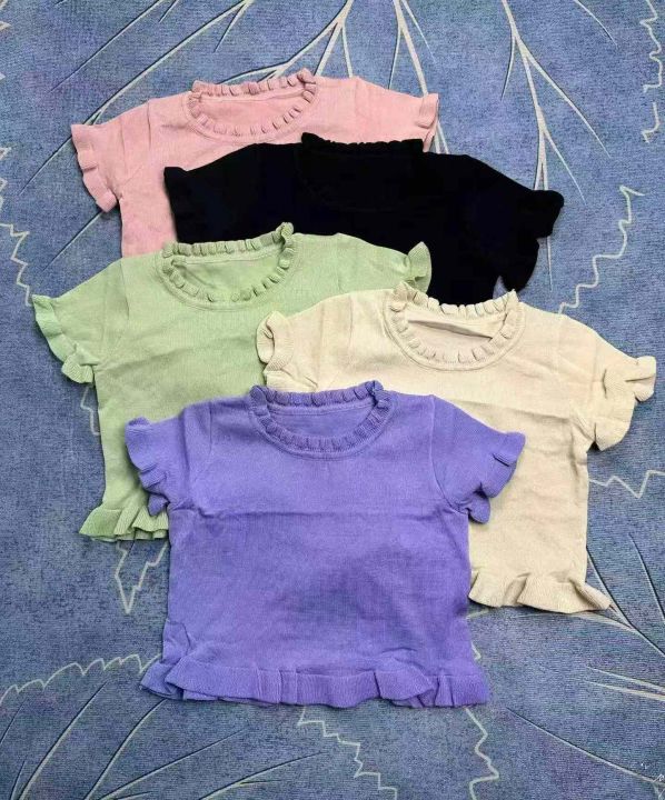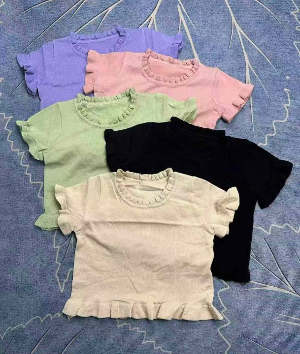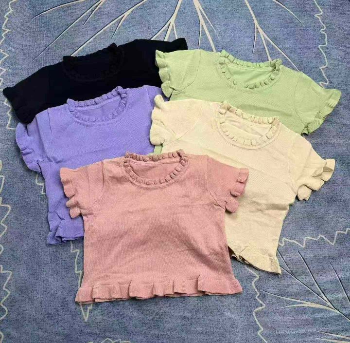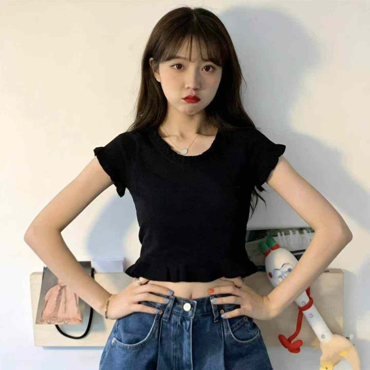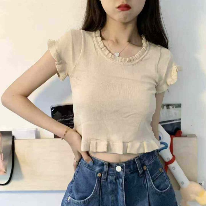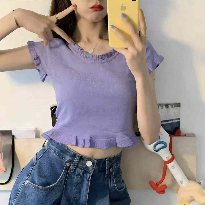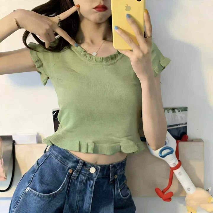 韩版洋气木耳边修身显瘦圆领短款短袖针织衫,独立包装,230件,清6.8,分➕0.5