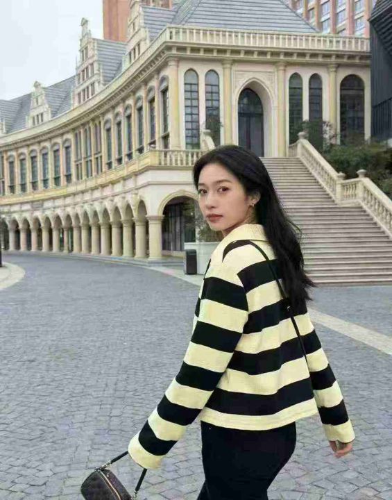 150件左右\'爆款秋季百搭休闲POLO领条纹宽松女新款慵懒风上衣,码数smlxl,独立包装,,货号001#31