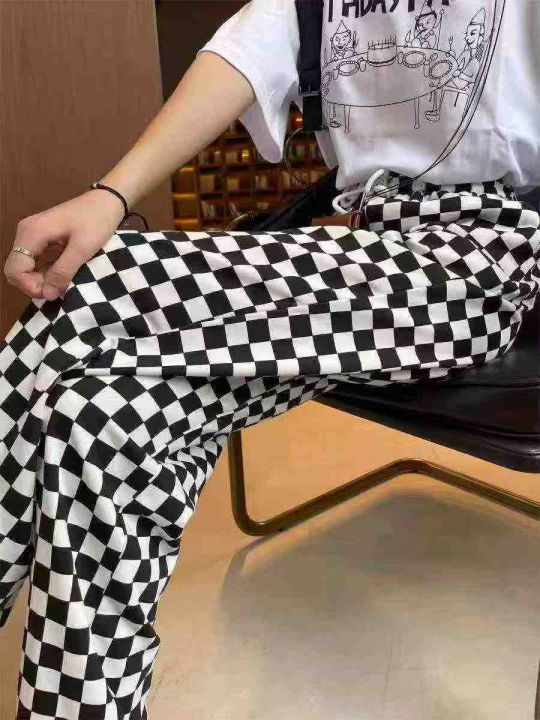 113条棋盘格休闲运动女裤新款宽松卫裤黑白格子直筒阔...