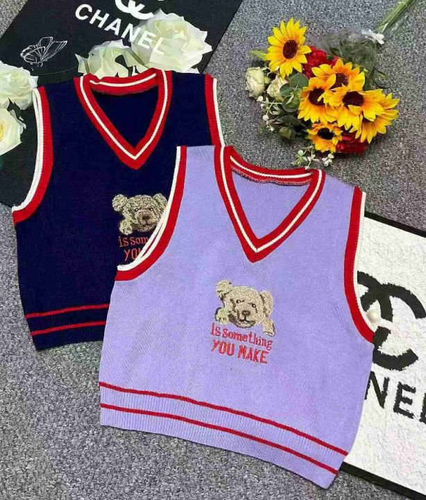 春季新款韩版学院风卡通小熊提花V领套头毛衣马甲,独...