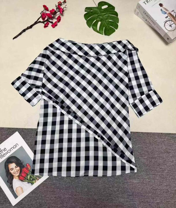欧美女装秋冬衬衫时尚个性露肩多色格子印花不规则上衣 ,整款三色,数量:407件,码数:S至2X L,品质好,拉链式独立包装。