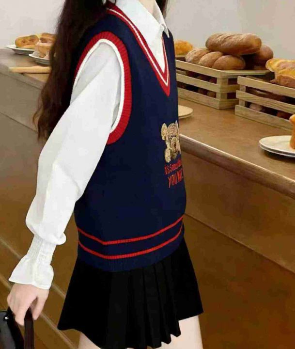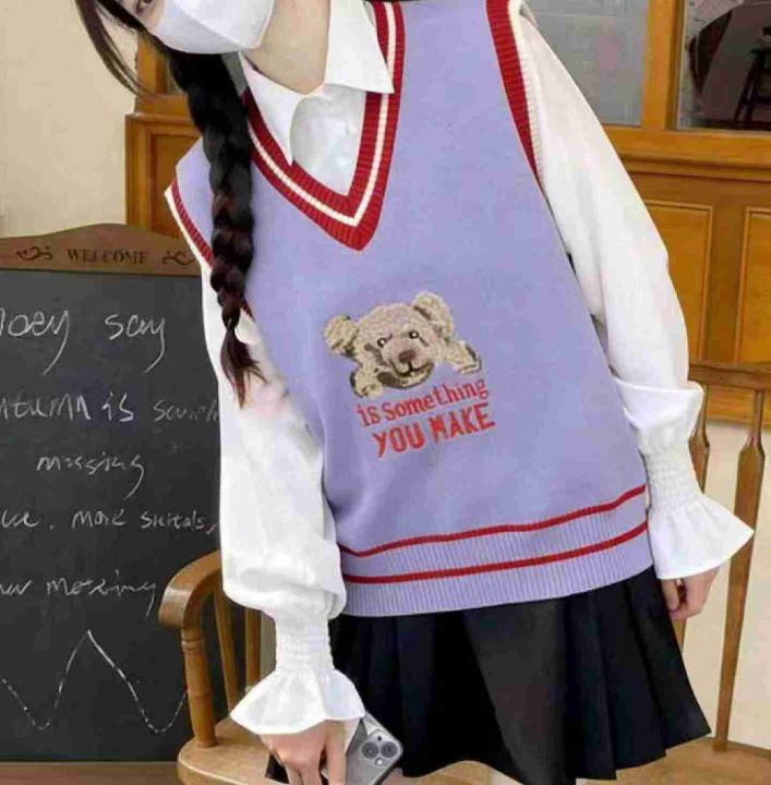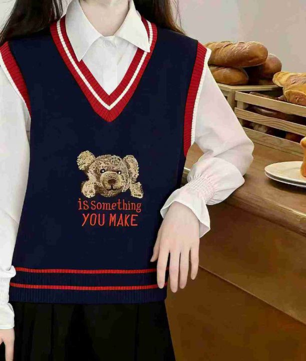 春季新款韩版学院风卡通小熊提花V领套头毛衣马甲,独...