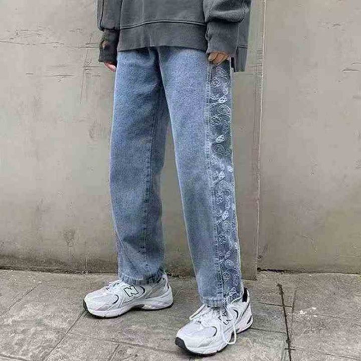 潮牌男女同款拼接提花可束脚牛仔长裤 70件,全清12.8元,不分货,正品独立包装,码数:L跟XL,高街腰果花裤子男女韩版潮流直筒宽松牛仔裤潮牌嘻哈束脚老爹长裤