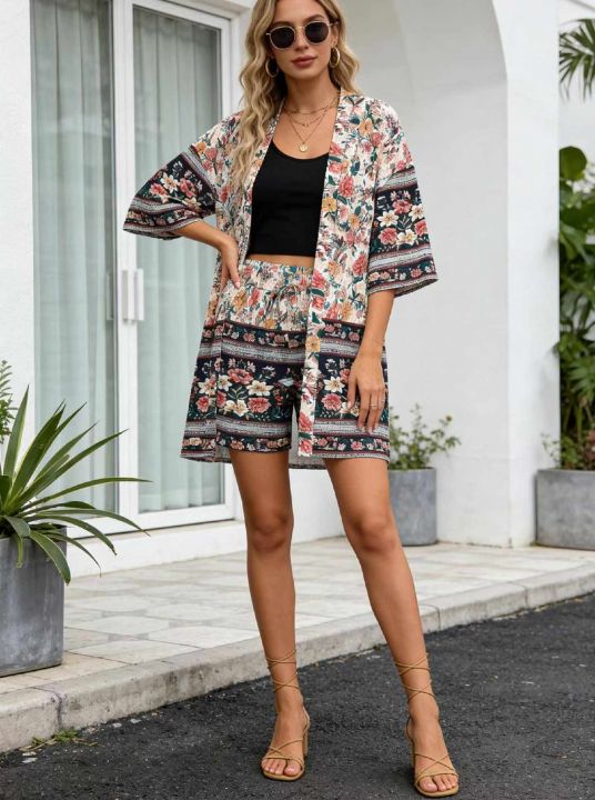 夏季新款品牌外贸原单美式宽松华衬衣短裤2件套套装,...