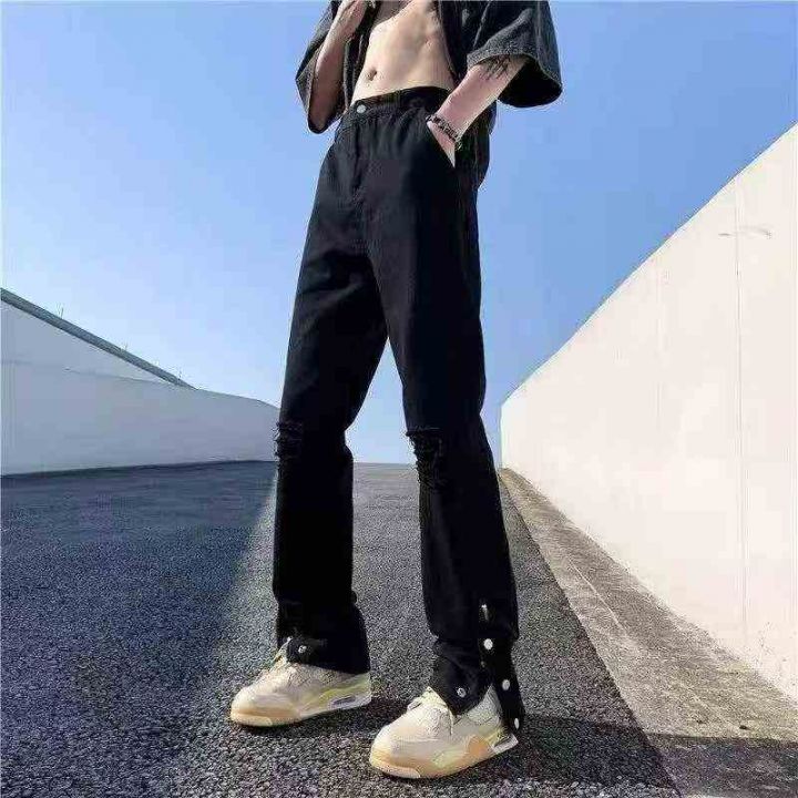 ☕️夏季黑色破洞牛仔裤男欧美高街拉链直筒裤潮牌阔腿...