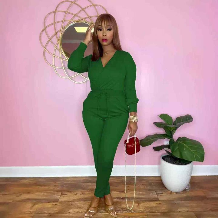 欧美时尚女装纯色V领抽绳时尚秋冬连体衣,整款三色,数量:432件,码数:S-2XL,品质好,拉链式独立包装。