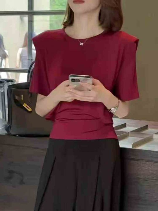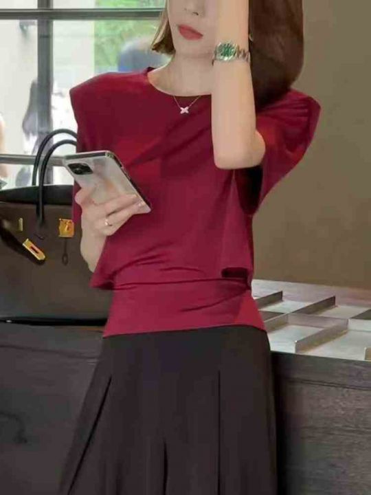 ❄️气质名媛风高级感酒红色法式绑带显瘦短袖上衣,单...