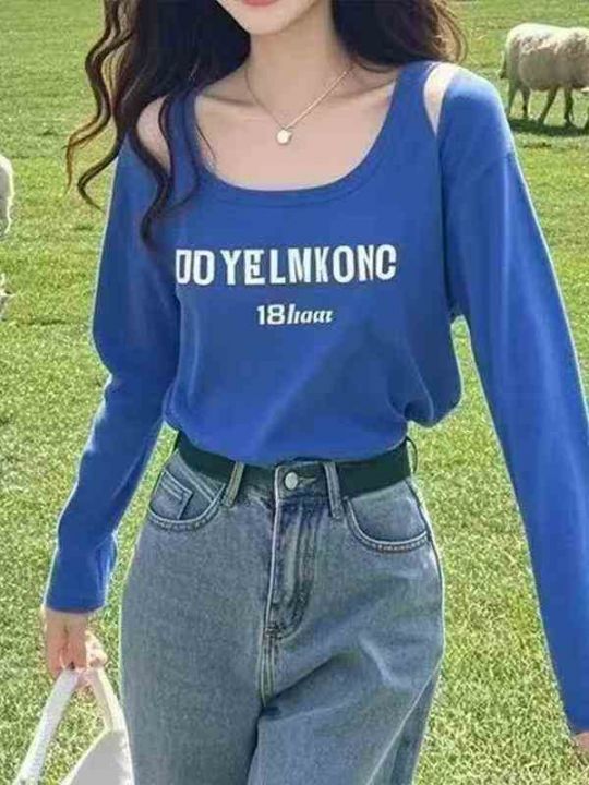❄️秋季设计感网红款露肩镂空字母印花长袖上衣休闲打...