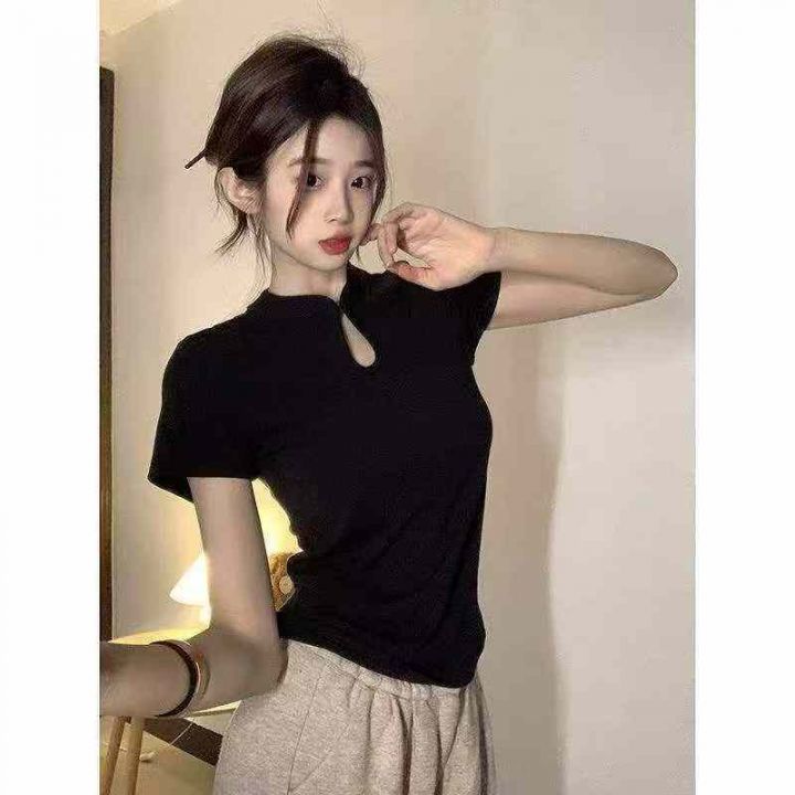 夏季新款弹力修身显瘦正肩新中式国风镂空针织短袖T恤...