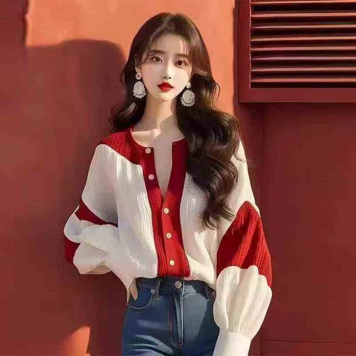 ❄️高级感别致红白撞色灯笼袖网红款雪纺衬衫,单款单...