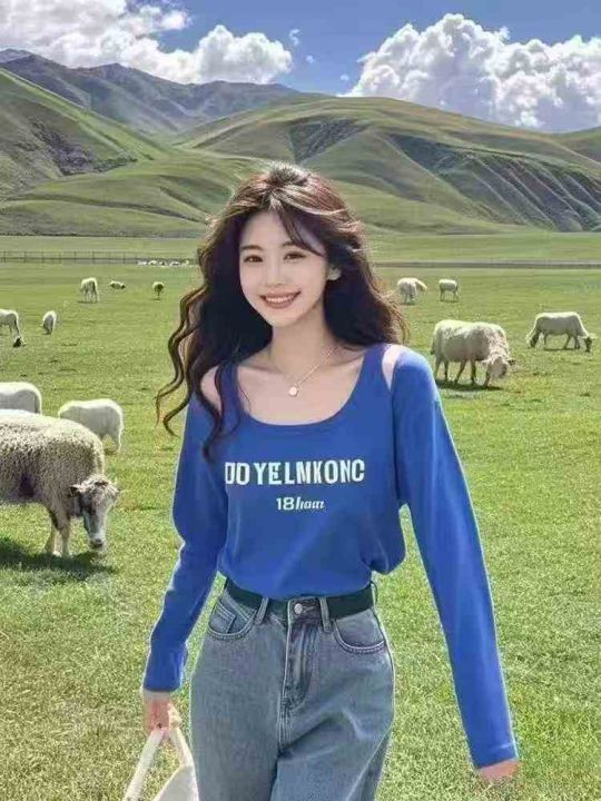 ❄️秋季设计感网红款露肩镂空字母印花长袖上衣休闲打底衫,单款单色,品质好,有独立包装带吊牌,码数S- XL,数量450件,全清6.8元秒