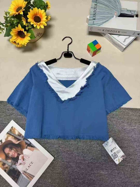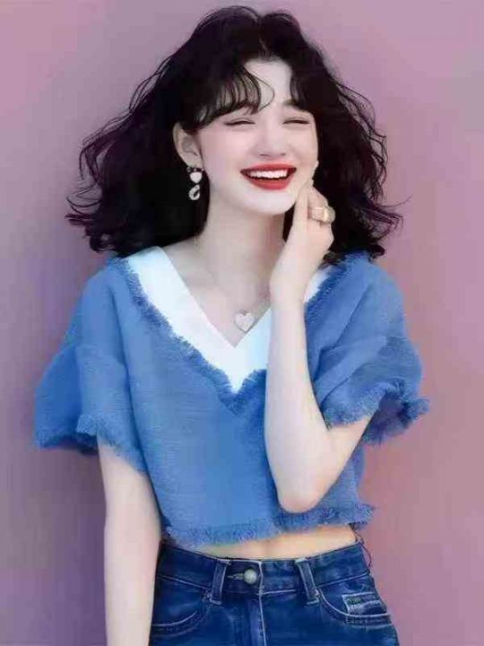 ❄️蓝白撞色v领流苏漂亮独特网红款短袖上衣,单款单...