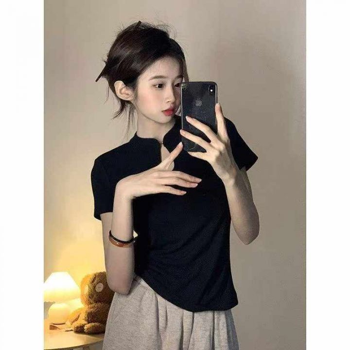 夏季新款弹力修身显瘦正肩新中式国风镂空针织短袖T恤...