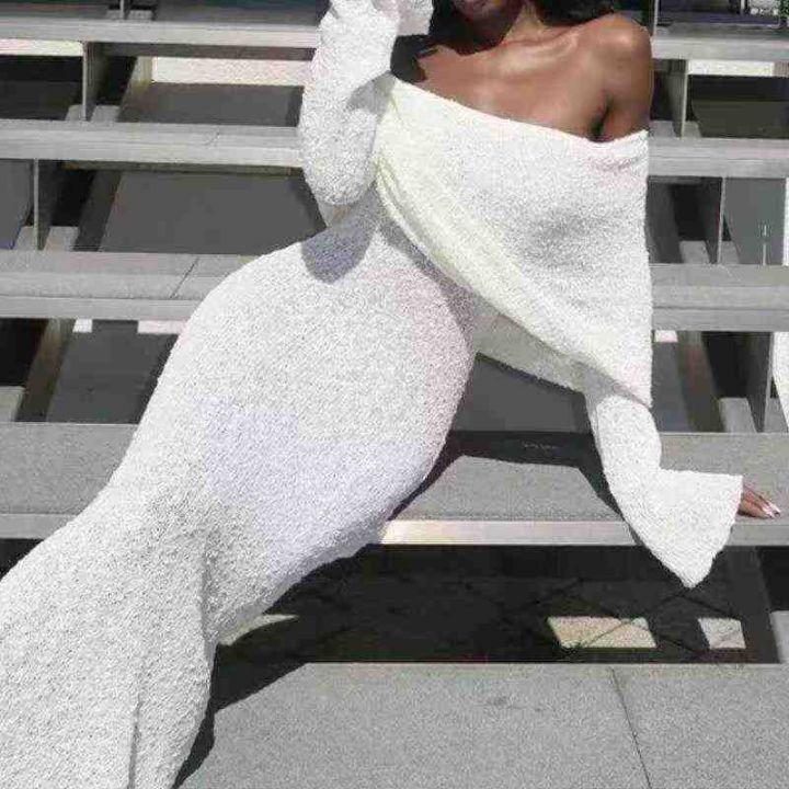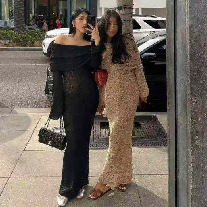 春夏季新款欧美风INS法式海边沙滩度假休闲长袖性感镂空针织一字肩连衣裙,独立包装,均码面料软糯舒适有弹力,350件,全清8.9元超低价秒杀!分货加一!