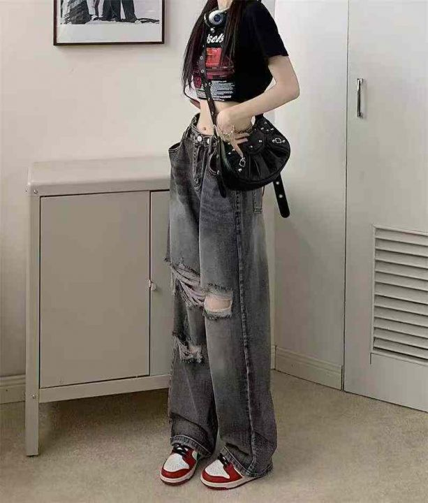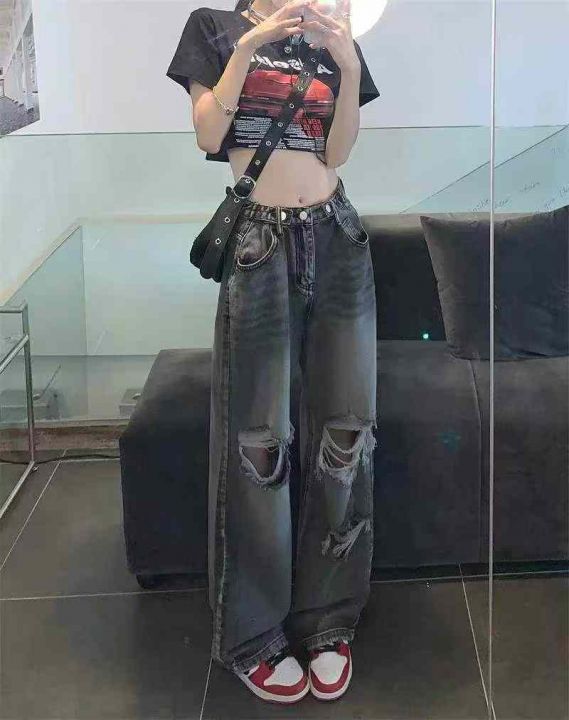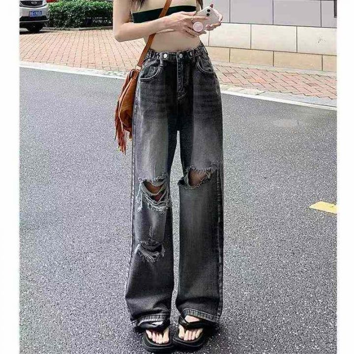 春夏季新款网红复古设计款可调节破洞直筒阔腿牛仔裤,...