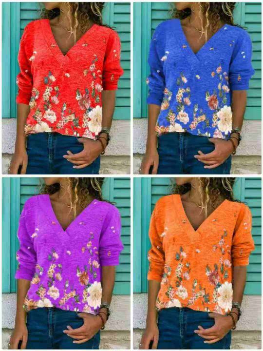 820件\'秋冬新款亚马逊wish欧美跨境女装V领套头印花长袖上衣T恤女,独立包装,码数5XL,分货➕1,货号001#30