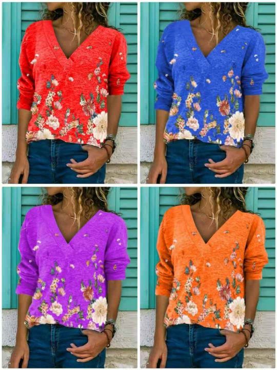 820件\'秋冬新款亚马逊wish欧美跨境女装V领套头印花长袖上衣T恤女,独立包装,码数5XL,分货➕1,货号001#30