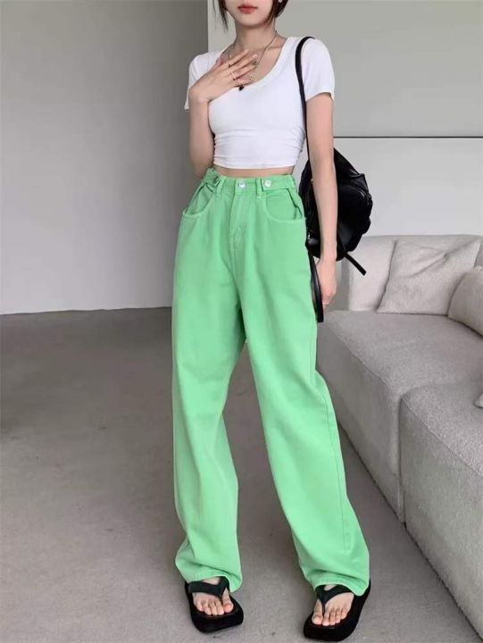 春夏季新款网红复古可调节洗水棉彩色直筒阔腿牛仔裤,...