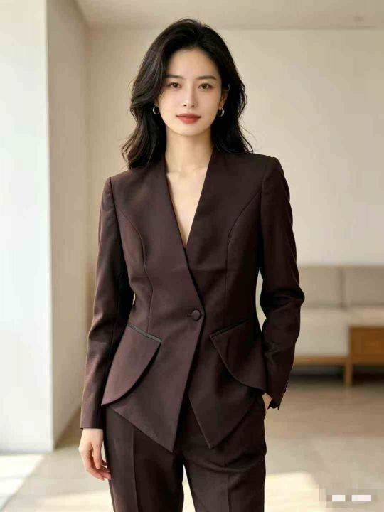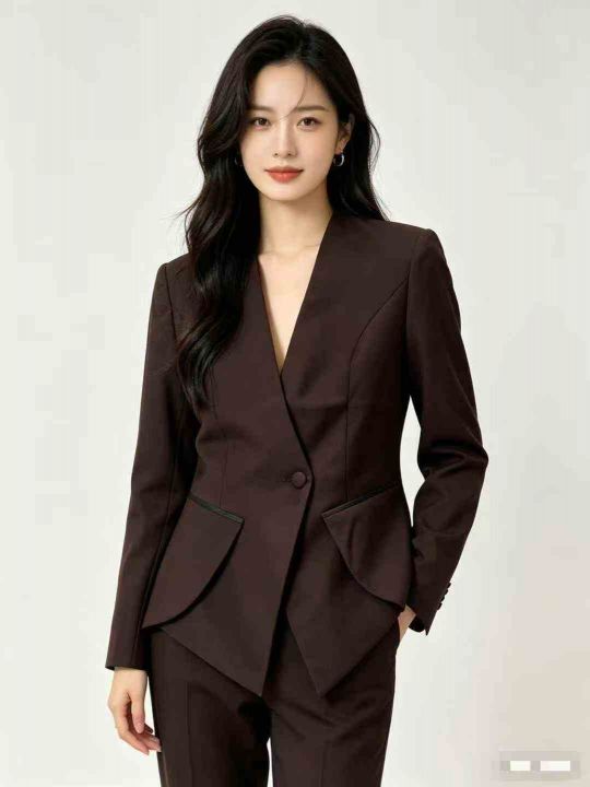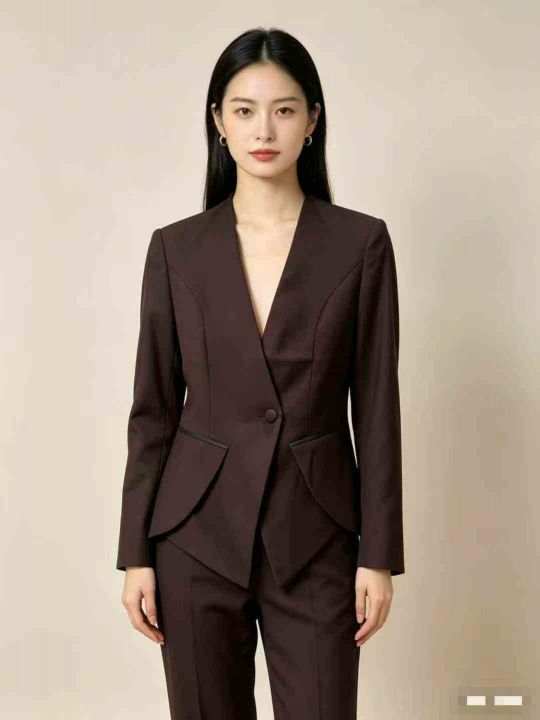 235件左右轻奢气质无领深咖色不规则下摆设计感西装,...