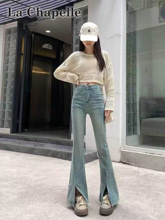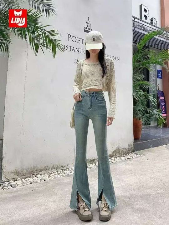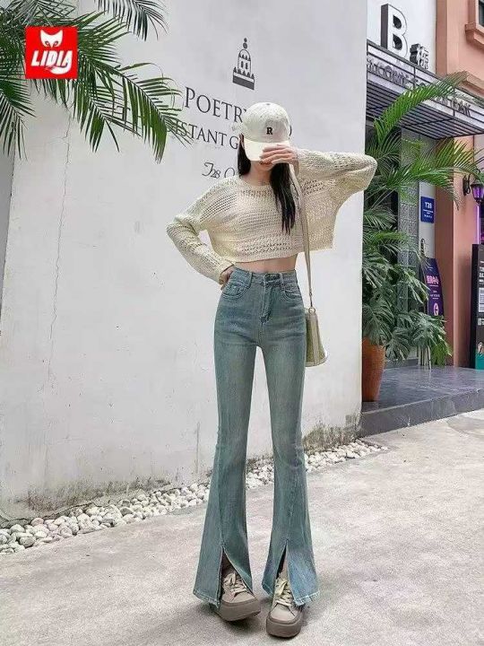 弹力复古蓝开叉喇叭裤微喇牛仔裤女春夏新款高腰修身九...