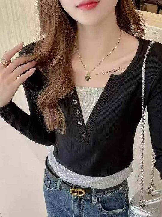 春季新款韩版正肩假两件V领修身显瘦设计感长袖上衣,...