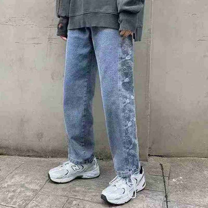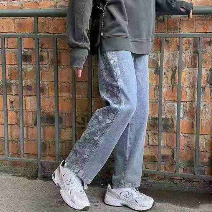 潮牌男女同款拼接提花可束脚牛仔长裤 70件,全清12.8元,不分货,正品独立包装,码数:L跟XL,高街腰果花裤子男女韩版潮流直筒宽松牛仔裤潮牌嘻哈束脚老爹长裤