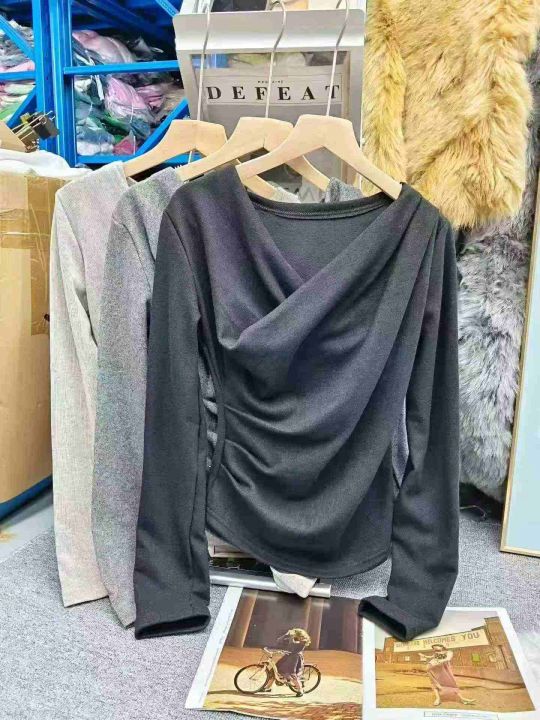 法式荡领辣妹长袖修身显瘦薄绒内搭打底衫上衣,独立包装,整款三色,码数S~XL,弹力好,数量235件,分货加1