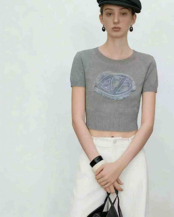 夏季新款美式辣妹牛仔贴布刺绣设计款冰丝针织小衫,独...