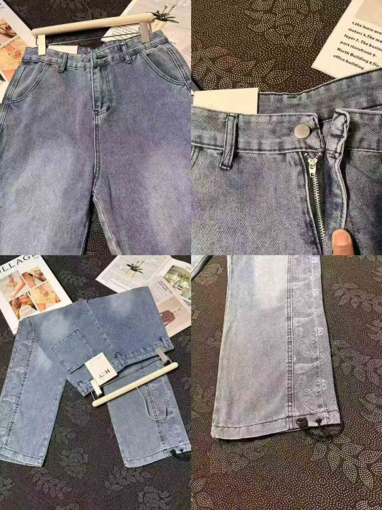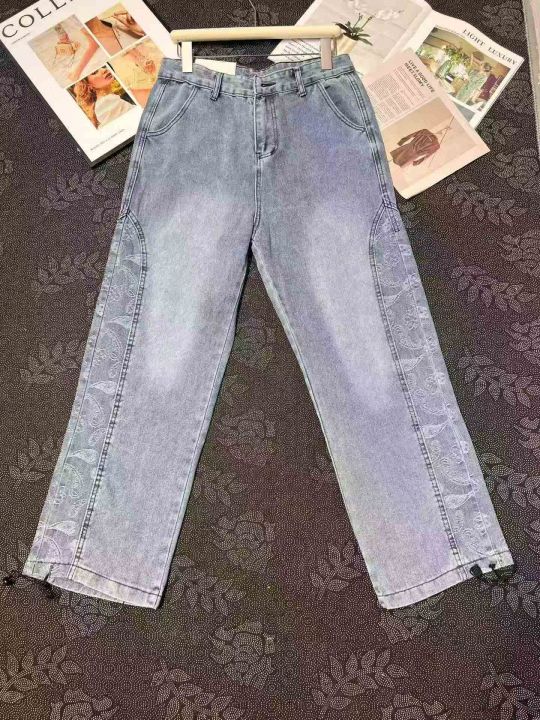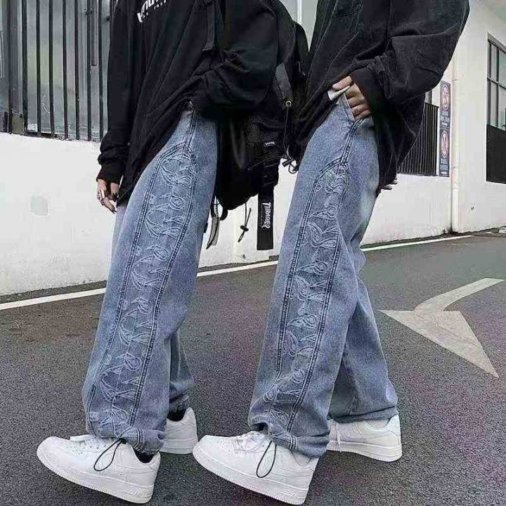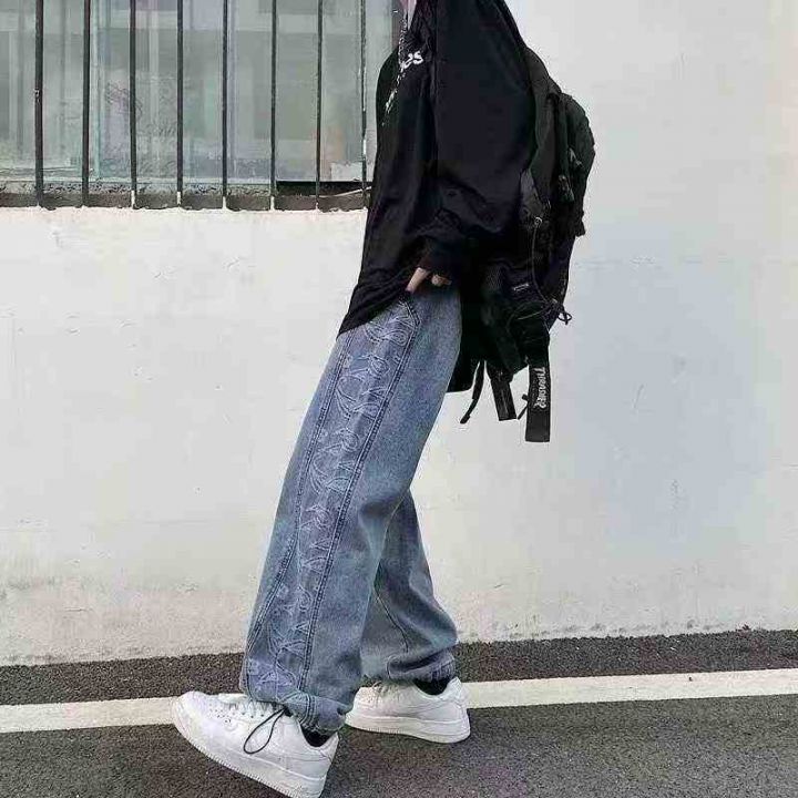 潮牌男女同款拼接提花可束脚牛仔长裤 70件,全清12.8元,不分货,正品独立包装,码数:L跟XL,高街腰果花裤子男女韩版潮流直筒宽松牛仔裤潮牌嘻哈束脚老爹长裤