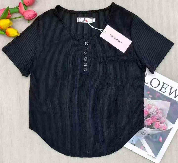 ☆5.8元,粗条冰丝辣妹T,夏季韩版修身短袖排扣靓妹T恤,透气舒适,150件,1-4码,独立包装吊牌,全清5.8元,不分货