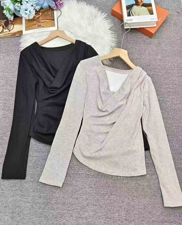 法式荡领辣妹长袖修身显瘦薄绒内搭打底衫上衣,独立包装,整款三色,码数S~XL,弹力好,数量235件,分货加1