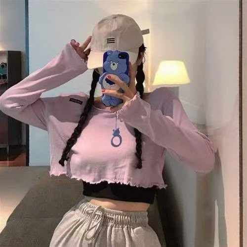 春夏季新款纯欲辣妹一字领小标设计感薄款针织长袖衫,...