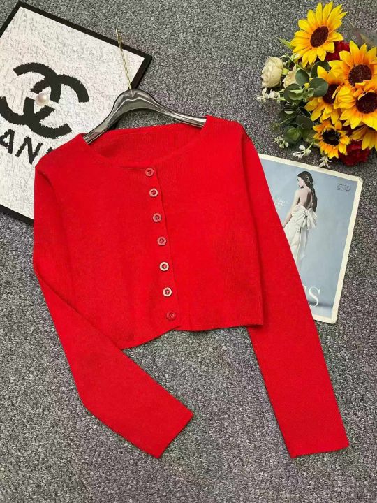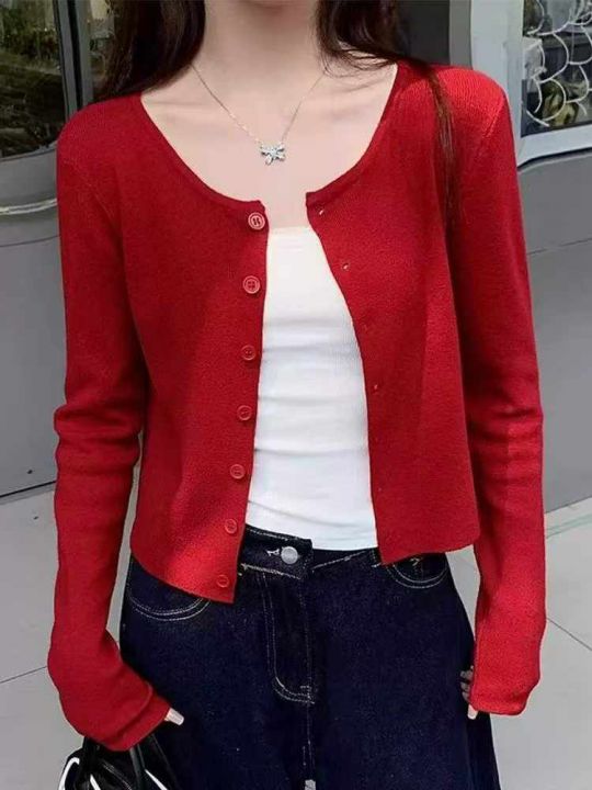 春季新款网红复古红色净版简约长袖针织开衫,独立包装...
