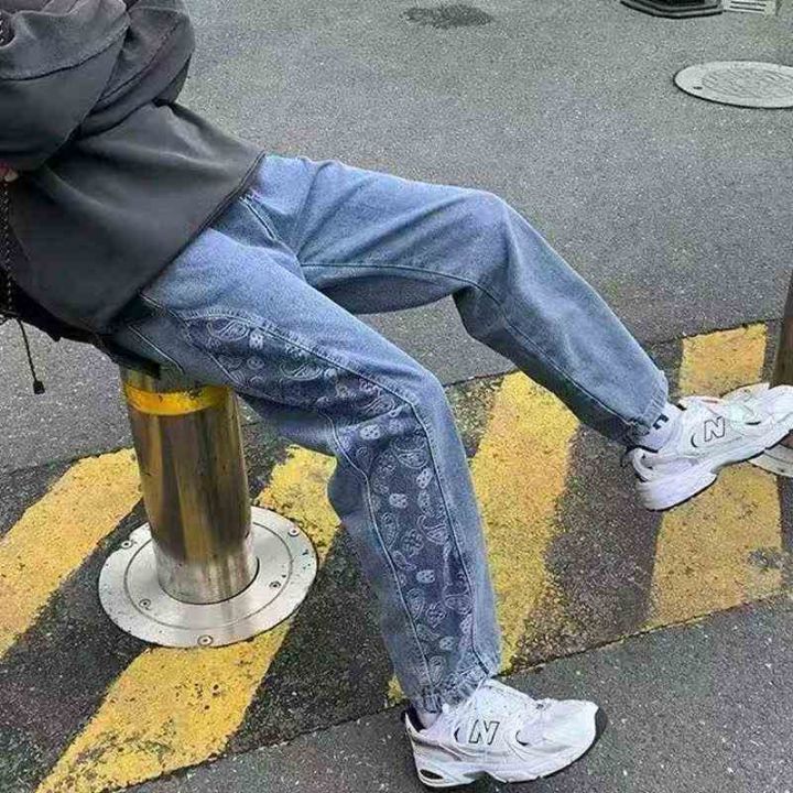 潮牌男女同款拼接提花可束脚牛仔长裤 70件,全清12.8元,不分货,正品独立包装,码数:L跟XL,高街腰果花裤子男女韩版潮流直筒宽松牛仔裤潮牌嘻哈束脚老爹长裤