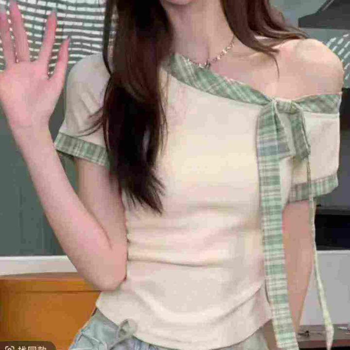 天猫在售款358件左右高品质夏季法系甜美风拼接条纹绑带蝴蝶结设计感漏肩上衣,码数M-L,单款两色,质量好,独立包装带吊牌