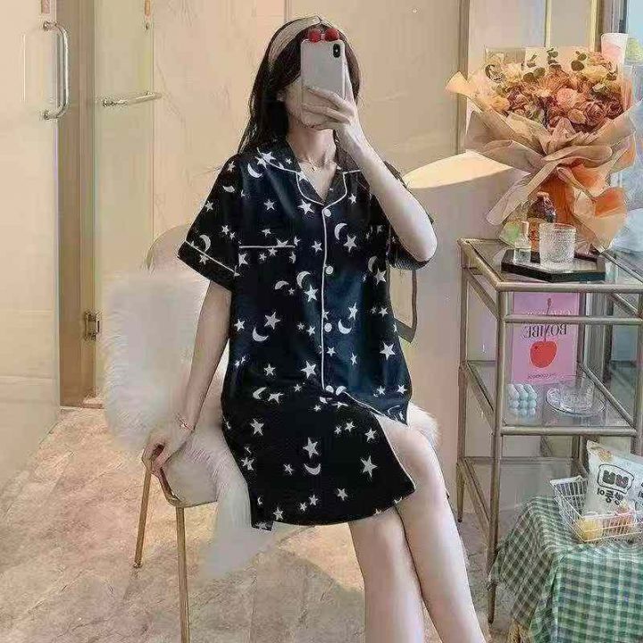 [月亮]:夏季垂顺纽扣开衫星星家居服睡裙