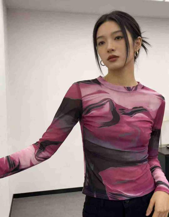 复古晕染网纱辣妹长袖77件7.8,面料舒适有弹力,褶皱设计,品质码数1-2码(...