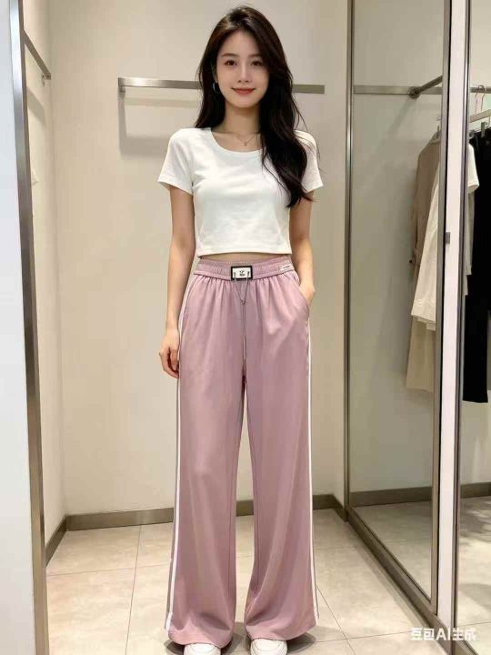 170条左右韩版慵懒风高腰垂感显瘦多色松紧腰直筒雪纺...