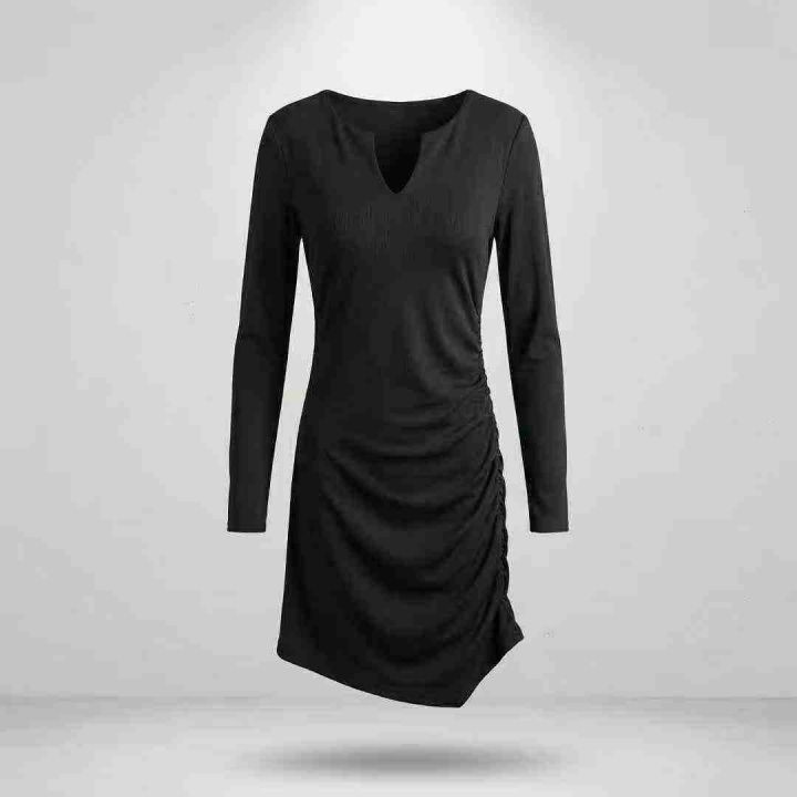 高品质女装整款加绒连衣裙 黑色V领侧打揽修身包臀裙 加绒显瘦长袖紧身辣妹包臀气质连衣裙