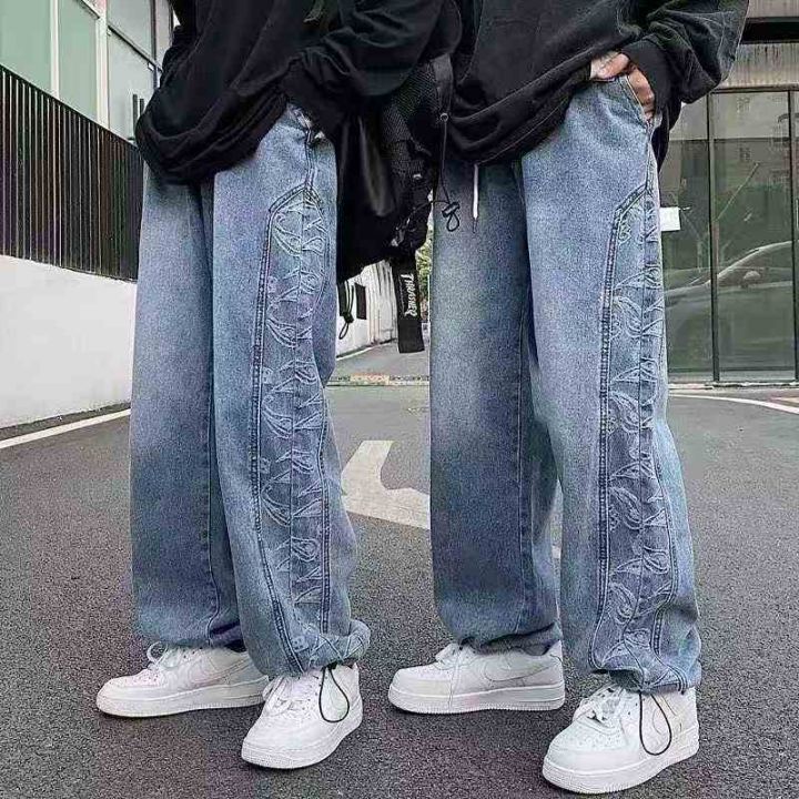 潮牌男女同款拼接提花可束脚牛仔长裤 70件,全清12.8元,不分货,正品独立包装,码数:L跟XL,高街腰果花裤子男女韩版潮流直筒宽松牛仔裤潮牌嘻哈束脚老爹长裤