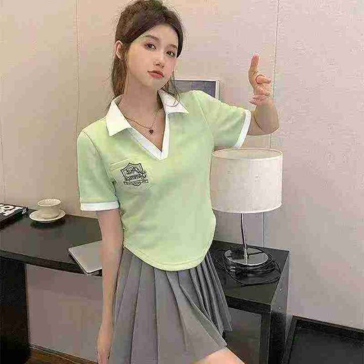 美式复古正肩polo衫撞色短袖棉t恤女夏宽松设计感小众别致短款上衣,数量260件,码数mlxl,独立包装,全清5.9元
