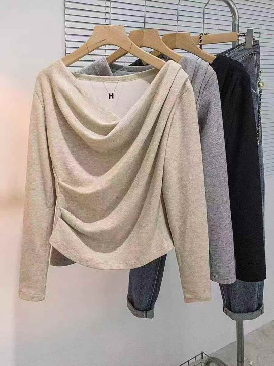 法式荡领辣妹长袖修身显瘦薄绒内搭打底衫上衣,独立包装,整款三色,码数S~XL,弹力好,数量235件,分货加1