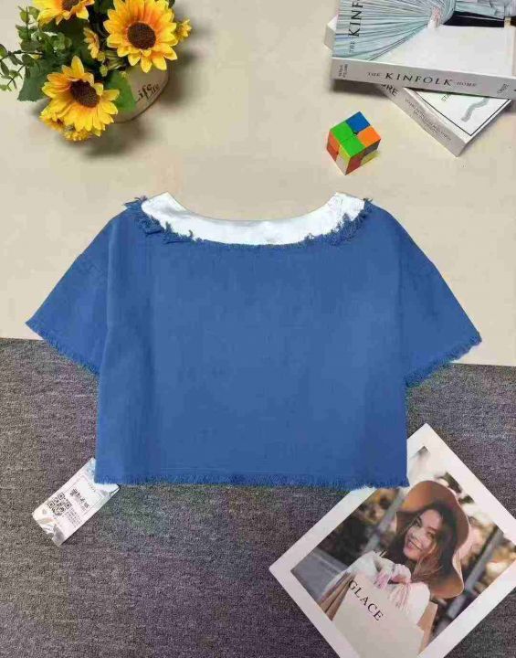 ❄️蓝白撞色v领流苏漂亮独特网红款短袖上衣,单款单...