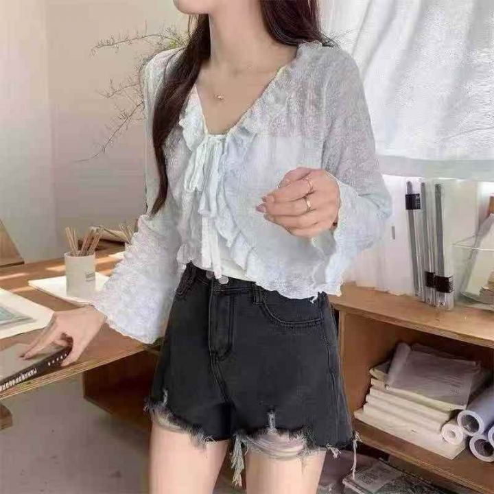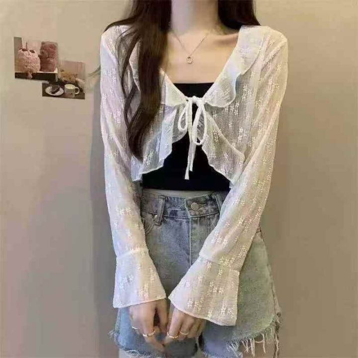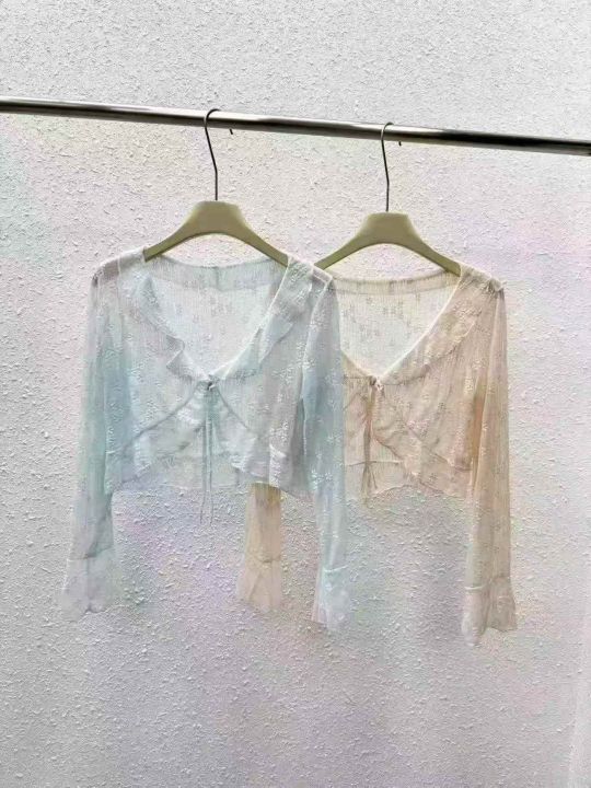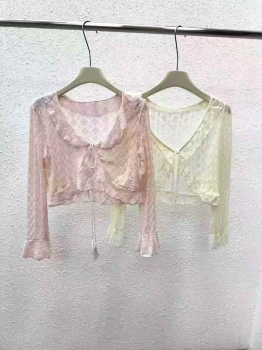14.9清透感拉满的蕾丝披肩开衫来啦!软糯透气的蕾丝面料,自带朦胧柔光感,防晒又不闷汗。短款系带/开襟设计,完美修饰肩颈线条,叠穿吊带裙、连衣裙都超绝,温柔中带着小性感!